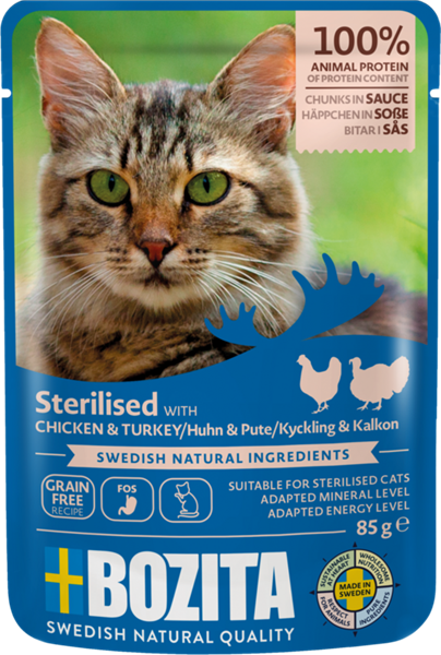 Bozita Sterilised Hühnchen & Pute ist ein ausgewogenes Alleinfuttermittel für die erwachsene Katze. Das Futter ist auf den etwas geringeren Energiebedarf von Wohnungs- und sterilisierten Katzen abgestimmt und somit auch für ältere und übergewichtige Katzen geeignet. Es enthält L-Carnitin, das ein wesentlicher Bestandteil des Stoffwechsels der Katze ist. Schwedisches Hühnchen und schwedische Pute machen das Futter besonders schmackhaft und leicht verdaulich, sodass die Katze die Nährstoffe leichter aufnehmen kann. Cellulosefasern reduzieren das Risiko von Haarballen. Zur Unterstützung einer gesunden Darmflora enthält das Produkt präbiotisches FOS. Das Produkt enthält ausserdem einen ausgewogenen und auf sterilisierte Katzen abgestimmten Mineralstoffgehalt (Ca, P, Mg) sowie einen hohen Anteil an Vitaminen und Taurin.