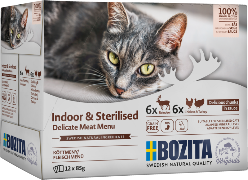 Bozita Sterilised Fleischmenü in Sosse ist ein ausgewogenes Alleinfuttermittel für die erwachsene Katze. Das Futter ist auf den etwas geringeren Energiebedarf von Wohnungs- und sterilisierten Katzen abgestimmt und somit auch für ältere und übergewichtige Katzen geeignet. Es enthält L-Carnitin, das ein wesentlicher Bestandteil des Stoffwechsels der Katze ist. Schwedisches Rentier sowie schwedisches Hühnchen und schwedische Pute machen das Futter besonders schmackhaft und leicht verdaulich, sodass die Katze die Nährstoffe leichter aufnehmen kann. Cellulosefasern reduzieren das Risiko von Haarballen. Zur Unterstützung einer gesunden Darmflora enthält das Produkt präbiotisches FOS. Das Produkt enthält ausserdem einen ausgewogenen und auf sterilisierte Katzen abgestimmten Mineralstoffgehalt (Ca, P, Mg) sowie einen hohen Anteil an Vitaminen und Taurin.