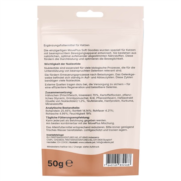 Die CellaVie® Katze MovePlus Soft Goodies sind die perfekte Kombination aus unwiderstehlicher Belohnung und zellulärer Gelenkpflege. Mit 70 % Hähnchen, bewährten Nährstoffen wie Grünlippmuschel und Kurkuma sowie innovativen Cell-K30-Nutrition® Nukleotiden unterstützen sie aktiv die Gelenk-Regeneration und fördern die Durchblutung. Der ideale, softe Snack für mehr Beweglichkeit und Agilität.